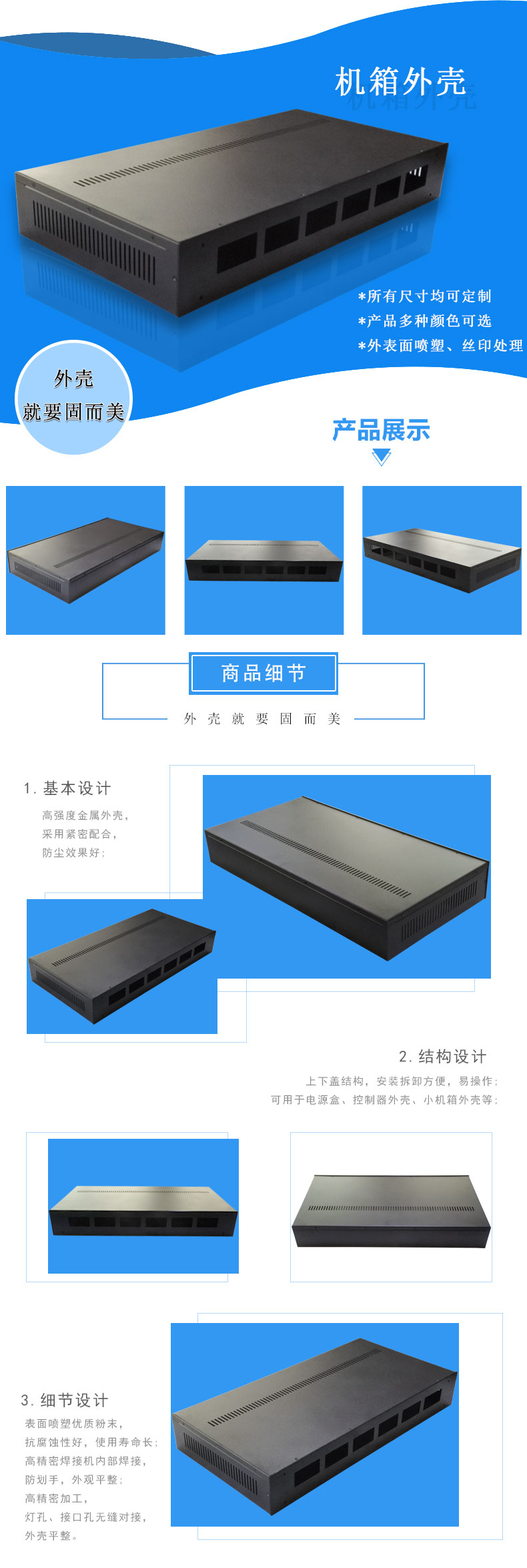 * 此款外殼適用于機箱外殼,工控服務(wù)機箱外殼,非標金屬機箱外殼定做,大機箱外殼來圖來樣設(shè)計。 * 產(chǎn)品材料:鍍鋅板 * 盒體采用開孔合理,免工具安裝 * 表面可噴塑,絲印 * 產(chǎn)品顏色和材料批量可訂制 * 所有尺寸均可按要求修改