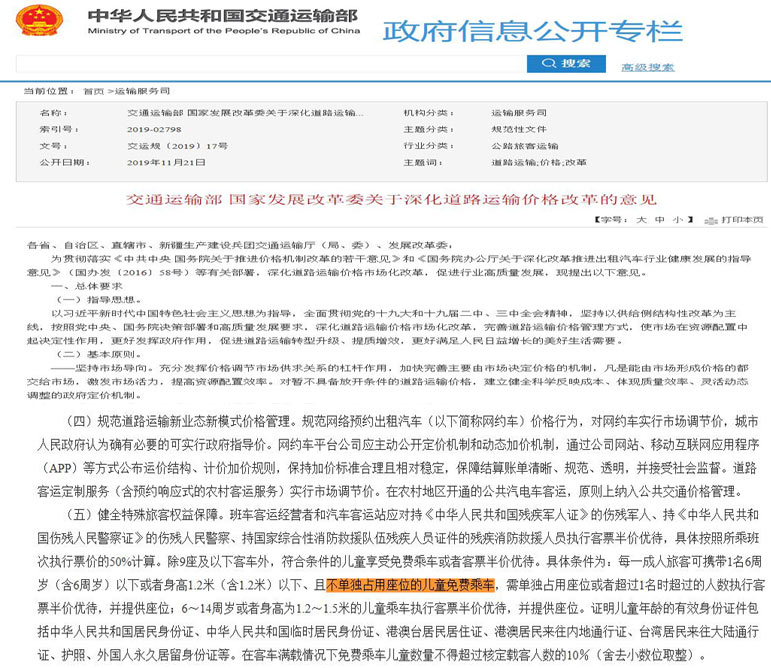 11月21日電(李金磊)交通運輸部會同國家發改委21日印發《關于深化道路運輸價格改革的意見》,明確符合條件的兒童乘坐客運班車享受免費乘車或者客票半價優待。在兒童身高標準基礎上,增加以年齡為依據的兒童票、免票劃分標準。