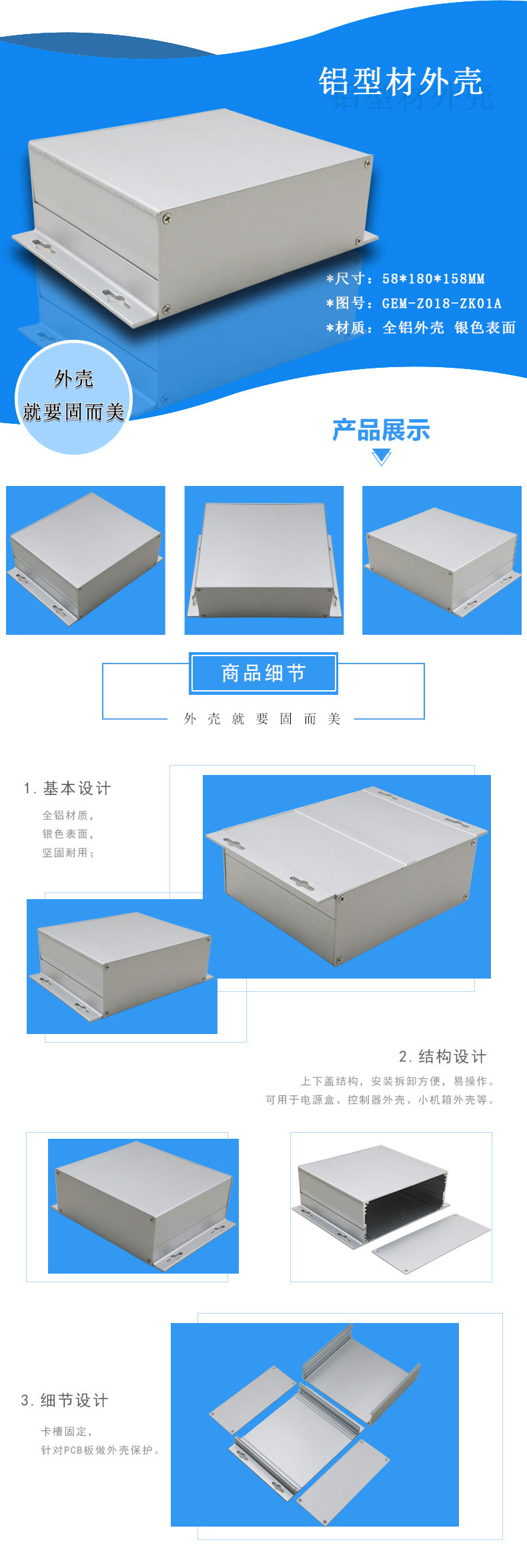 特點:1.全鋁材質(zhì),銀色表面,堅固耐用,卡槽固定,針對PCB板做外殼保護。